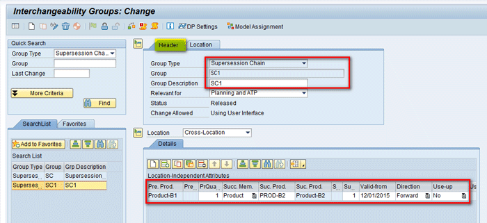 Creation of a supersession chain is described in detail in the first part of the article on product interchangeability in SNP. Figure 17 is an example of the supersession chain. In the Header tab, you can see that the name of the supersession chain is SC1. In the Location-Independent Attributes section, the field in the Pre. Prod (predecessor product) column is Product-B1, and the Suc. Prod. (successor product) column is Product-B2. The field in the Valid-from column is 12/01/2015, and the field in the Use-up column is No (Figure 17).