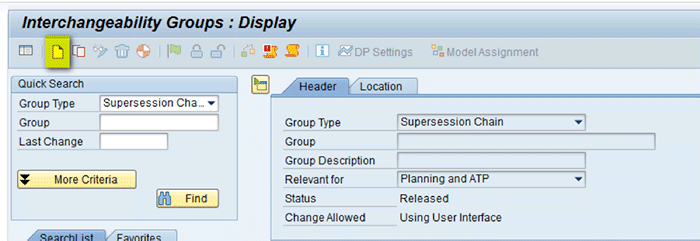 The interchangeability group for product substitution (i.e., supersession chain) is combined in the product determination procedure. To create interchangeability master data for the product substitution procedure, execute transaction /INCMD/UI. In the screen that appears, click the create icon highlighted in Figure 19.