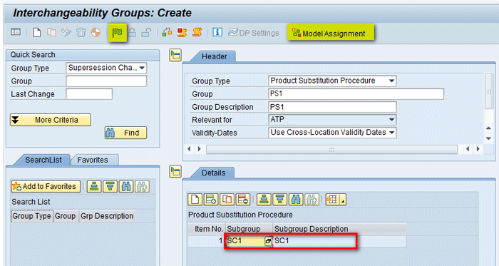 In the new row that is created, enter the name of the subgroup that you created in the above section on supersession chain in the field in the Subgroup column (e.g. SC1). Press Enter. The Subgroup Description is autopopulated. After you enter the details, click the release flag icon and then click the Model Assignment button as shown in Figure 21.