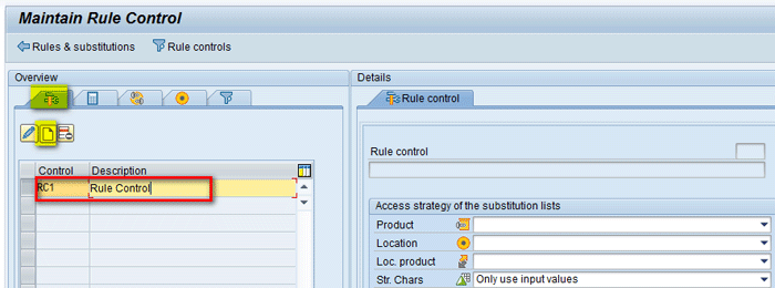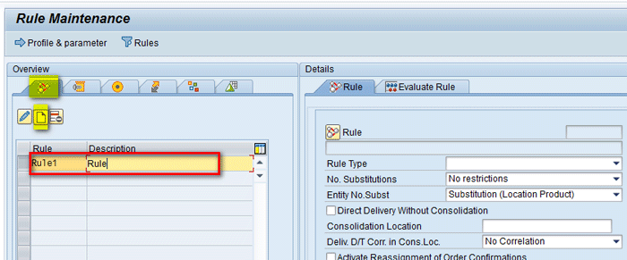 After you click the Rules and substitutions button in Figure 24, select the maintain rule icon (highlighted in yellow below Overview in Figure 25), and then click the create icon. A new row is now populated. In the field in the Rule column, enter a name (e.g., RULE1) and enter a description (e.g., Rule) in the field in the Description column. Press Enter.