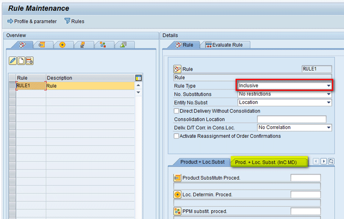 In the same screen, on the right side you can see Rule RULE1 is populated. In the Rule Type field, select Inclusive from the drop-down list of options as shown in Figure 26. Leave the default settings in the other fields and select the Prod. + Loc. Subst. (InC MD) tab.
