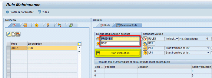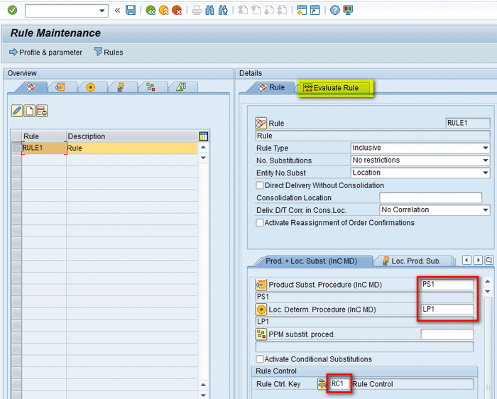In the refreshed screen, enter a name in the Product Substitutn. Proced. (product substitution procedure) field (e.g., PS1). In the Loc. Determin. Proced. (location determination procedure) field, enter a name (e.g., LP1). In the Rule Control section enter RC1 in the Rule Ctrl. Key (rule control key) field. These names are the names of the procedures you created in the above sections. Now click the Evaluate Rule tab as shown in Figure 27.