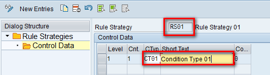 In the screen that appears (Figure 35), select the Control Data folder and enter RS01 in the Rule Strategy field. In the field in the CTyp (control type) column, enter CT01 (the name of the condition type created in step 5) to assign this condition type to rule strategy RS01. Press Enter to save your entries.