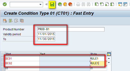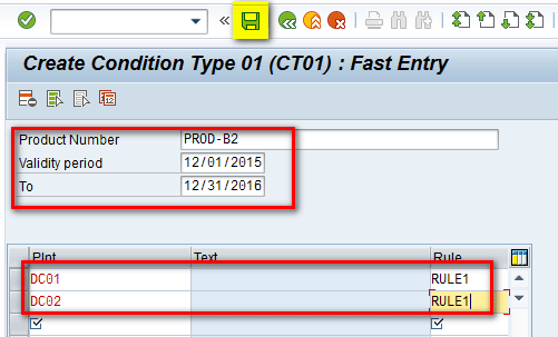 In the same screen, follow the same steps to create an entry for PROD-B2 valid from Dec-2015 at DC01 and DC02 and save the changes as shown in Figure 40.