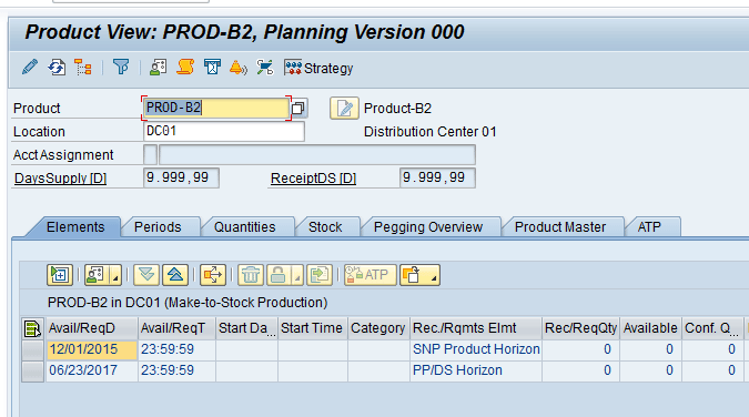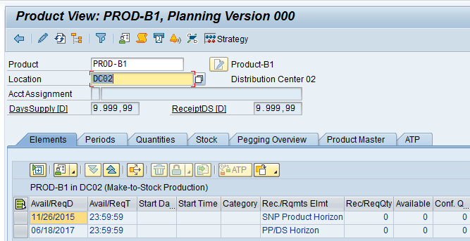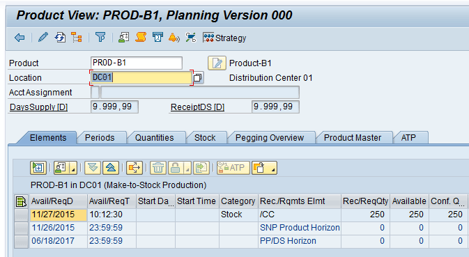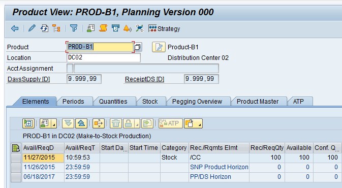 In the next screen (Figure 48), you can see that requirement of 200 is not confirmed because in the supersession chain you have defined the Use-up strategy as No and the Valid Date is 1 Dec 2015. Therefore, PROD-B1 is no longer valid after 1-Dec-2015 and with Use-up as No, it can’t use the existing stock of 100 after 1-Dec-2015. In the above scenario, the requirement of 200 was on 12/30/2015 and since PROD-B1 is no longer valid on that date and can’t be used, its stock requirement was shifted to PROD-B2 at DC01. However, since PROD-B2 at DC01 does not have any stock as shown in Figure 43, the quantity of 200 quantity was not confirmed here either.