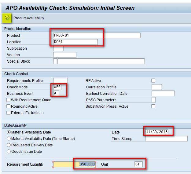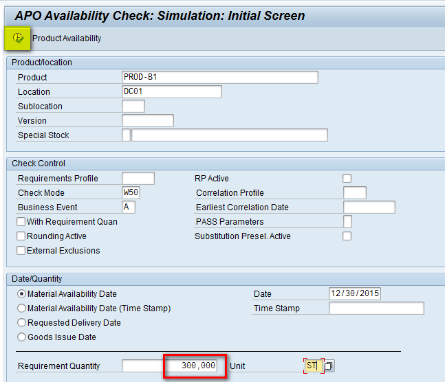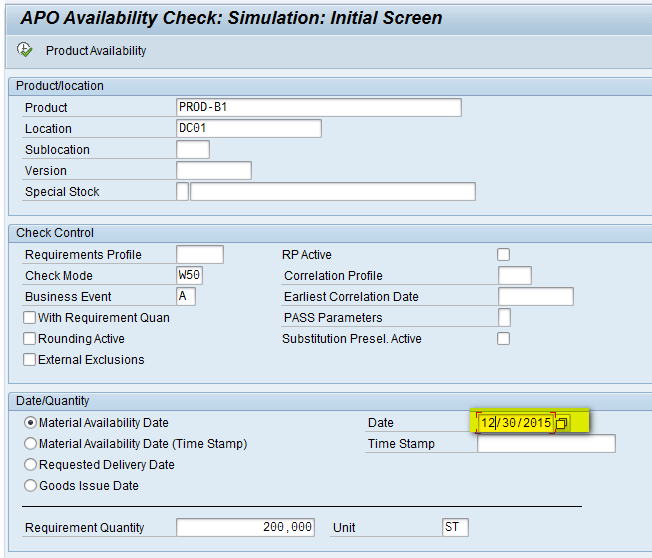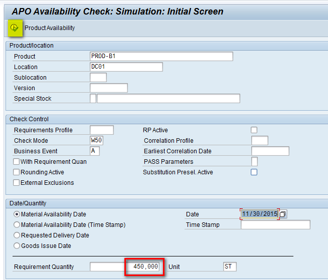 To run ATP simulation, execute transaction code /SAPAPO/AC04. In the screen that appears (Figure 44), enter parameters in the following fields: