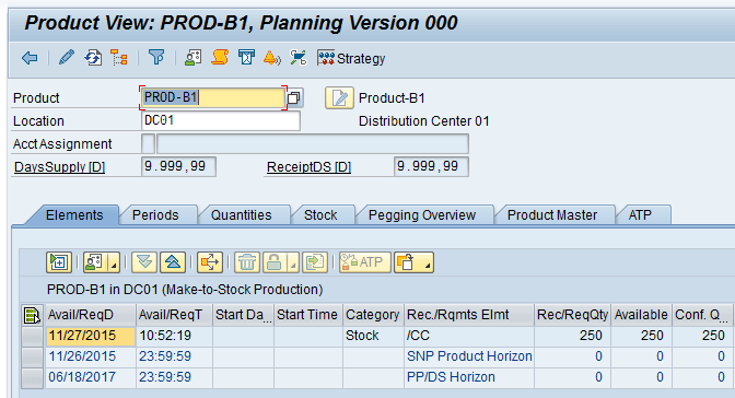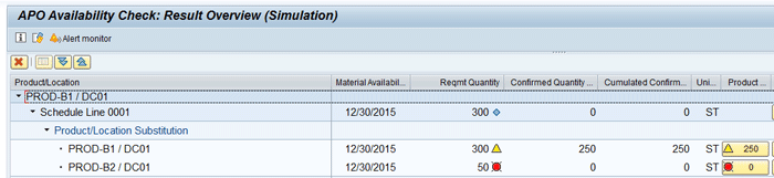 In the next screen (Figure 52), you can see that out of the requirement of 300, 250 is confirmed at DC01. After that the system tried to confirm the remaining 50 for PROD-B2 at DC01 as per the supersession chain, but since PROD-B2 at DC01 has no stock, it was not confirmed.
