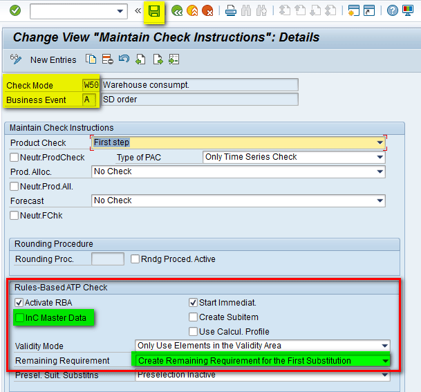In the screen that appears (Figure 41), make a new entry in the Check Mode field (e.g., W50) and Business Event field (e.g., A). The other fields are default entries that you do not change. In the Rules-Based ATP Check section, define the important configuration related to using rules-based availability and product interchangeability directly.