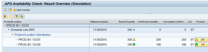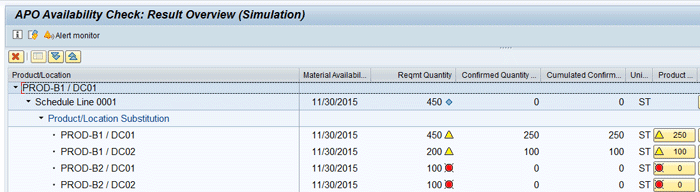 In the next screen (Figure 61), you can see that out of the requirement of 450 quantity, 250 are confirmed for PROD-B1 at DC01, and 100 are confirmed at DC02. For the remaining 100, the system tried to check for PROD-B2 at DC01 and DC02, but since both have zero stock, it was not able to confirm as shown in Figure 61.