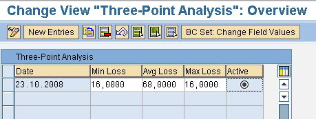 The three-point analysis estimates realistic total losses for each impact category of a given risk event. Instead of estimating the total loss right away, you estimate a minimal total loss in the best case, a maximum total loss for the worst case, and an average total loss for an average case. The system then computes the total loss as the weighted mean of the three estimates. You can customize the used weights by following IMG menu path GRC Risk Management > Risk and Opportunity Analysis > Define Three-Point Analysis (Figure 1).