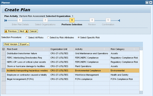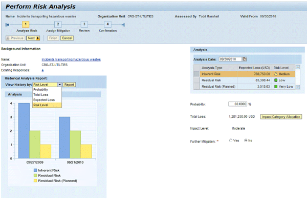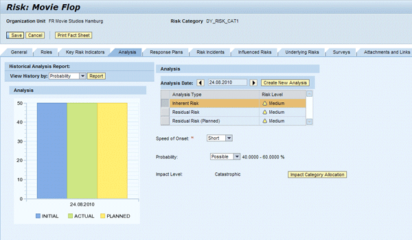 In the enterprise risk management (ERM) process, risk identification and risk analysis are considered two distinct steps. Risk identification focuses on gathering relevant risk information from all stakeholders in your enterprise in a collaborative process. It describes risk events in terms of different driver and impact categories and relates them to master data structures (e.g., organizational entities, strategic objectives, business activities, and risk categories) set up during the risk planning phase of the ERM process. Risk analysis is all about the prioritization of identified risks in a formal process employing qualitative or quantitative methods. SAP BusinessObjects Risk Management 3.0 supports the analysis of three different types of risk measures for the same risk event: