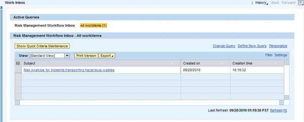 By default, the recipients of the workflow tasks for a risk analysis are the risk owners of the selected risks. For each risk, they receive a separate workflow task in their inbox, which is accessible via menu path GRC Risk Management > My Home > Workflow Inbox (Figure 11).
