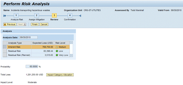 The risk owner can set the Further Mitigation radio button on the bottom of the screen if he wants to review the analysis of the residual risk or add risk responses for further mitigation. As this article focuses on inherent risk analysis, I’ll skip this part for now and leave this radio button unchecked so the risk owner moves straight to step 3 of the guided procedure, where he reviews the results of the risk analysis (Figure 14). Finally, clicking Finish brings the risk owner to the last step, just containing a system confirmation.