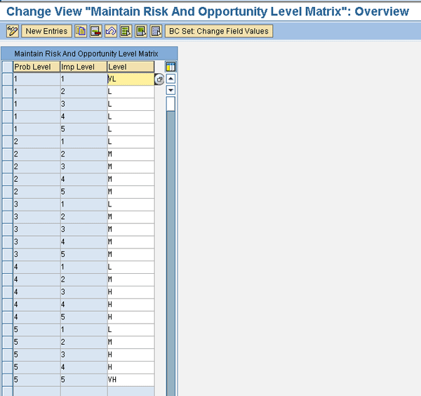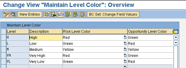 The application combines the probability level and impact level for a given risk event into a risk level according to the customizing settings in GRC Risk Management > Risk and Opportunity Analysis > Maintain Risk and Opportunity Level Matrix (Figure 3). You maintain impact level descriptions by following IMG menu path GRC Risk Management > Master Data Setup > Maintain Impact Levels. However, you need to configure the conversion of impacts from various units of measure into a monetary value and the monetary value into an impact level during the setup of the organizational entities in the risk planning phase of the ERM process.