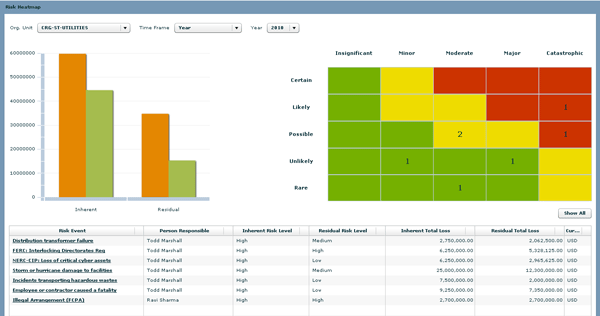 Total and expected losses of inherent and residual risks, risk heat map, and risk details for a selected organizational entity and time frame