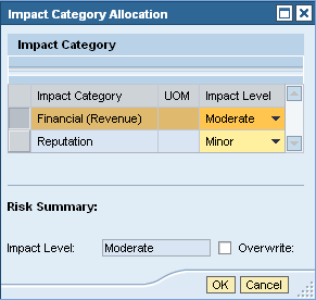 In SAP BusinessObjects Risk Management 3.0, risk owners can base a risk analysis for a given risk event on their estimates for three distinct factors: probability, impact, and speed of onset. The application converts the estimates for probability and speed of onset into a discrete probability level and computes a discrete impact level out of the impact allocations for various impact categories. The system then combines the probability and impact level to an overall risk level used to prioritize risks.
