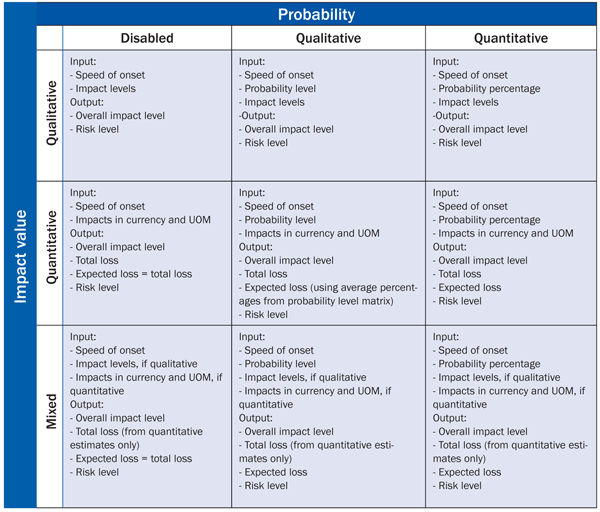 The settings made here affect the user interface (UI). For example, if you set the speed of onset to inactive, the drop-down list from which you select the speed of onset disappears from the risk analysis screen. Similarly, the Qualitative setting for probability or impact value brings up drop-down lists from which you select respective levels. The Mixed setting for the impact value means that for each impact category you can select whether the impact allocation is made quantitatively, estimating a total loss in an adequate unit of measure (UOM), or qualitatively, directly assigning an impact level from the drop-down list appearing in the UI.
