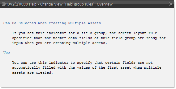 When you set up the screen layout for the fixed asset screen layout, an additional column is visible: Multi…. (Multiple). Figure 4 shows the settings for the screen layout with the additional column visible on the right. If you press F1 while your cursor is in on one of the check boxes under the Mult… column in Figure 4, a message appears like the one shown in Figure 5.