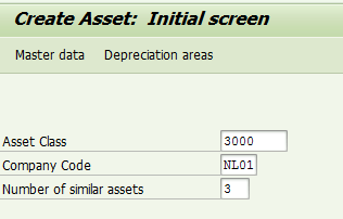 Execute transaction code AS01 to create the assets. In the initial screen (Figure 6) in this example, create three assets (enter 3 in the Number of similar assets field) belonging to asset class 3000 (enter this code in the Asset Class field).