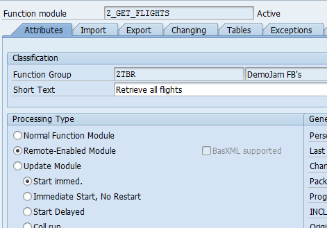You find your function module, Z_GET_FLIGHTS, in the Function Modules folder. To call the function module from outside the SAP system, you have to change the processing type from a normal function module to a remote-enabled module. Double-click Z_GET_FLIGHTS and select the Attributes tab. In the Attributes tab screen (Figure 12), select the Remote-Enabled Module radio button.