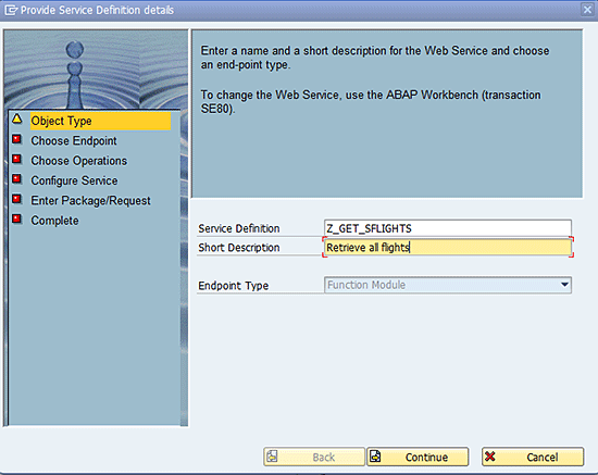 In the screen displayed in Figure 14, enter the name of the Web service (Z_GET_FLIGHTS) in the Service Definition field and a Short Description name (Retrieve all flights), and click the Continue button.