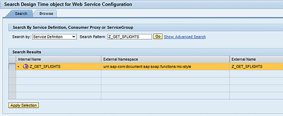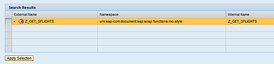 Figure 22 shows the program search results. Click Z_GET_SFLIGHTS in the External Name column and click the Apply Selection button.