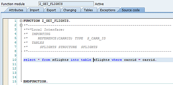 Next, you have to write code to retrieve all the flights that match the import parameter CARRID. To write the code, click the Source code tab (Figure 5).