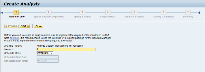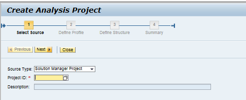 In the Source Type: field, choose Solution Manager Project for the parameter and enter your project name in the Project ID: field. Click the Next button. Enter a descriptive name in the Define Profile entry screen (Figure 11) and keep the defaults for the other parameters.