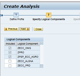 In the Name field enter a description for the analysis and click the Next button. The Specify Logical Components screen (Figure 16) lists the logical components assigned to the System Landscape tab of the project as it was defined in SOLAR_PROJECT_ADMIN. By default, the ones used in the project structure in SOLAR01 are already selected and cannot be removed.