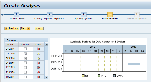 The Select Periods screen (Figure 18) allows you to choose the time scope for the analysis. The Solution Manager SDA uses data logged in the managed system to perform its analysis. This data is compartmentalized into monthly buckets. Choose the time frame you wish to analyze and click the Next button.