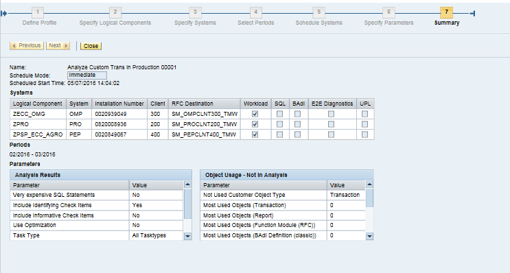 In the Specify Parameters screen (Figure 20), mark the Transaction check box under the Not Used Customer Objects parameter set to identify the custom transactions that are not used in the managed system.