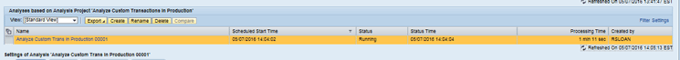 When you select a particular Analysis Project (highlighted in orange in Figure 14), you have several options, including clicking the Create button. With the Create button, you can create an analysis using the newly created analysis project. An analysis is an executable instance of an analysis project. You can run any number of analyses for a given analysis project. This analysis is helpful when you are comparing different systems in the same landscape. For example, you might want to confirm that the training or quality assurance instances are the same as the production system. You can run a separate analysis for each of these systems and compare the results.