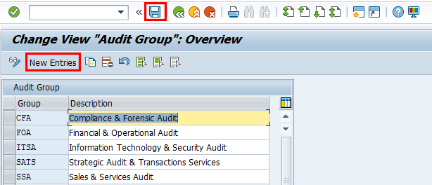 This customizing activity allows you to define audit groups. An audit group is a mandatory definition for auditable items and audit. It is a field that must be filled with values when creating auditable items and an audit, which is why values must be maintained in customizing first.