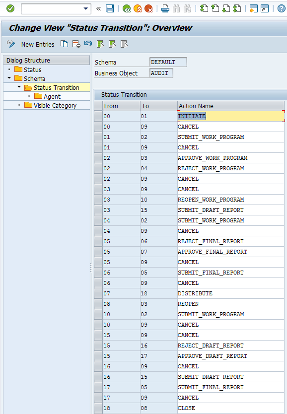 As seen in the details of the status transition definition, every change in status is associated with an action. For example, if the audit business object moves from draft to initiate, the corresponding action is labelled INITIATE, which depicts the action initiating the change of status. Furthermore, the figure shows all possible status changes that can be associated with a business object for a particular schema. For example, status draft (00) can have a destination status of 01 (INITIATE) and 09 (CANCEL).