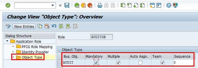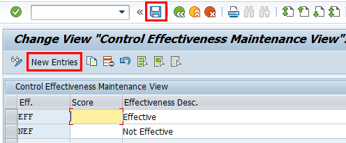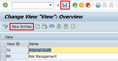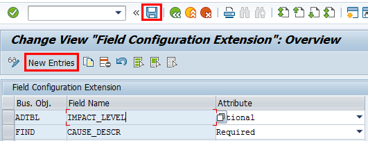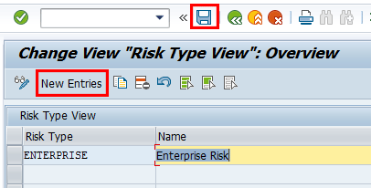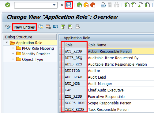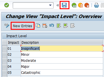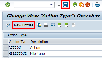 To add entries, click the New Entries button and provide an identifier for the action type and corresponding description. Save your entry by clicking the save icon.