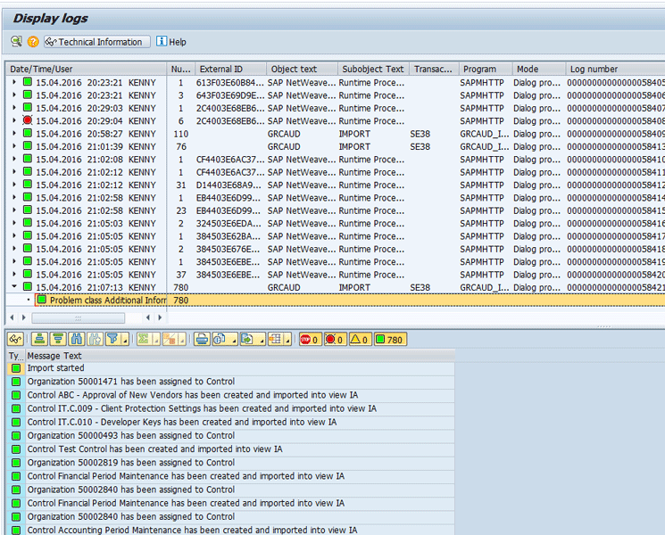 Log of import operation in the application log tool