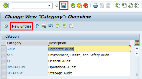 To add a new audit category, click the New Entries button and provide values in the Category field and a Description as desired. Click the save icon.