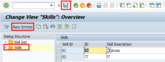 To review or maintain skills, double-click the Skills folder (Figure 63), which shows the standard entries. To add entries, click the New Entries button and provide an identifier for the skill set and corresponding description. Save your entry by clicking the save icon.