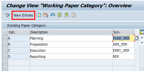 To add entries, click the New Entries button and provide an identifier for the Working Paper Category, report ranking, and corresponding description. You enter a value for the Cat. field and consequently a value in Scn. field. Associate the entry with a file generation scenario and save your entry by clicking the save icon.