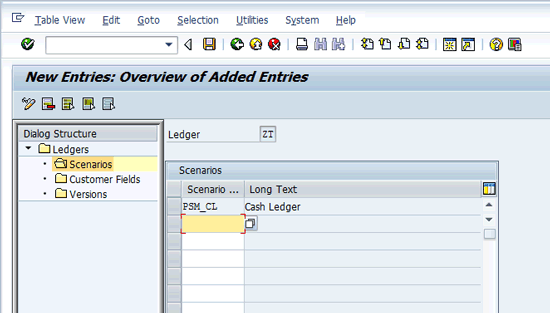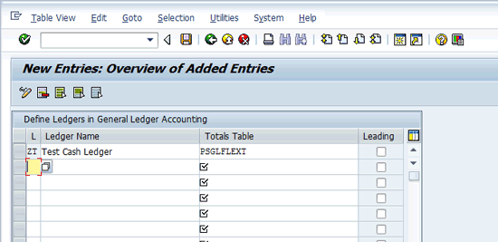 To define the ledger on the screen named Change View Define Ledgers in General Ledger Accounting: Overview, click the New Entries button or follow menu path Edit > New Entries. Define the ledger with an ID and name. Assign the totals table and save the entry. In my example I created a ledger with an ID named ZT (Test Cash Ledger) and assigned the totals table PSGLFLEXT to this ledger (