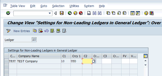 On the next screen click the New Entries button or follow menu path Edit > New Entries. Enter the company code (e.g., TEST) under the C... column. In case of any requirement for additional currencies, differing fiscal year variant, and posting periods, you enter the details in the rows under C2 and C3 for currencies and fiscal year variant and posting period variant. In my example I keep the same fiscal year variant and posting periods, so the details are not entered (