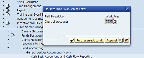 Follow menu path SPRO > Public Sector Management > Fund Accounting > General Ledger Accounting (New) > Cash-Basis Accounting and Cash Flow Reporting > Cash-Basis Accounting > Classify Payment-Relevant G/L Accounts. In the pop-up box enter the chart of accounts or select the chart of account from the list by clicking the possible entries icon next to the field in Work Area and click the green arrow icon . In my example, the chart of accounts is TEST (