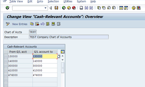 In the screen named Change View “Cash-Relevant Accounts”: Overview, click the New Entries button and enter the required G/L account. In this screen you can also enter the range of G/L accounts relevant for the cash ledger (