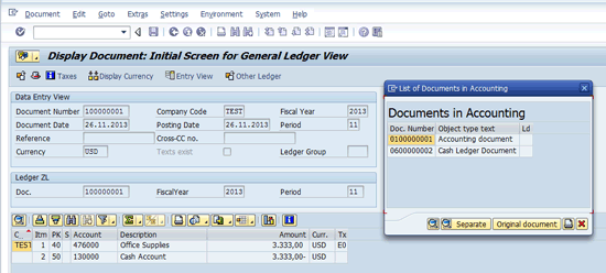 Figure 10). This transaction is not relevant for the cash ledger because there is no cash payment. Therefore, no document is posted to ledger ZT.