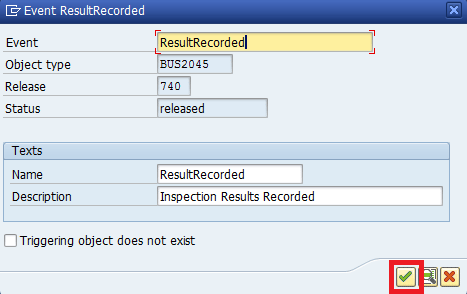In the pop-up screen that opens (Figure 5), enter ResultRecorded in the Event and Name fields. In the Description field, enter Inspection Results Recorded, and then click the continue icon (the green checkmark).