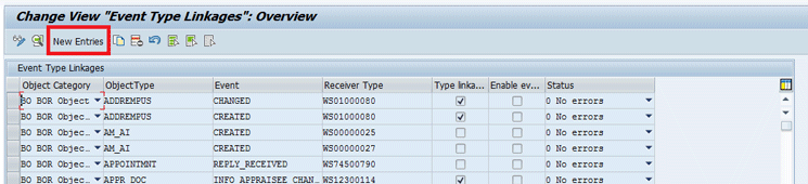 You can create the event type linkage after you execute transaction code SWETYPV. After you execute transaction code SWETYPV, click the New Entries button to add a new event type linkage (Figure 7).