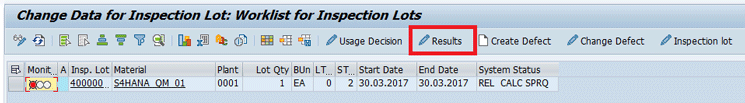 Execute transaction code QA32 to find this inspection lot, select it, and then click the Results button (Figure 13) to post the inspection results and the set values for the inspection characteristics.
