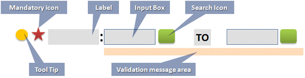 Business applications with dozens of fields for input information need consistent layout for all input fields along with a standard sequence for these fields. Elements for input fields include tooltip icons, mandatory field indicators, field labels, separators (e.g., :), input field boxes, search icons, and format guidelines (