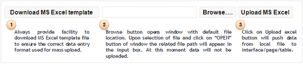 - Using an improper grouping of UI elements that does not clearly convey a typical upload sequence. For example, in Figure 5 if you place the Download MS Excel Template button next to or immediately before the Upload MS Excel button, you can confuse the user about the correct upload sequence.