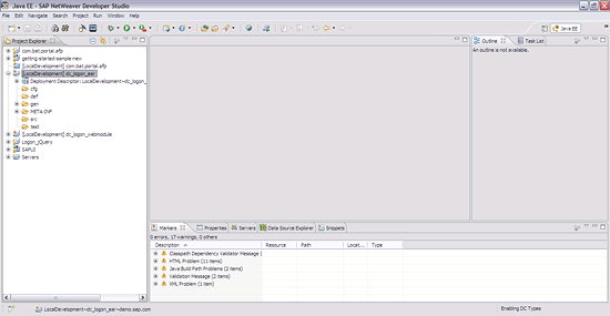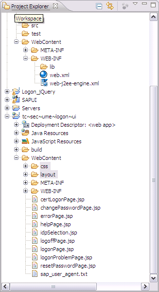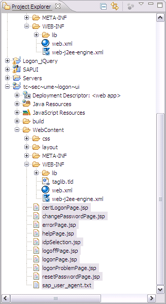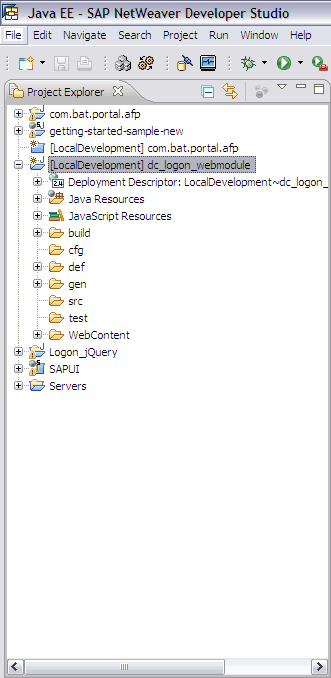 Note that 7.3 Portal officially supports Java EE 5.0, but Logon Page framework is an exception, so it is important you make this change. Once you are done with Web Module DC creation, you can see the project structure in the Project Explorer view (